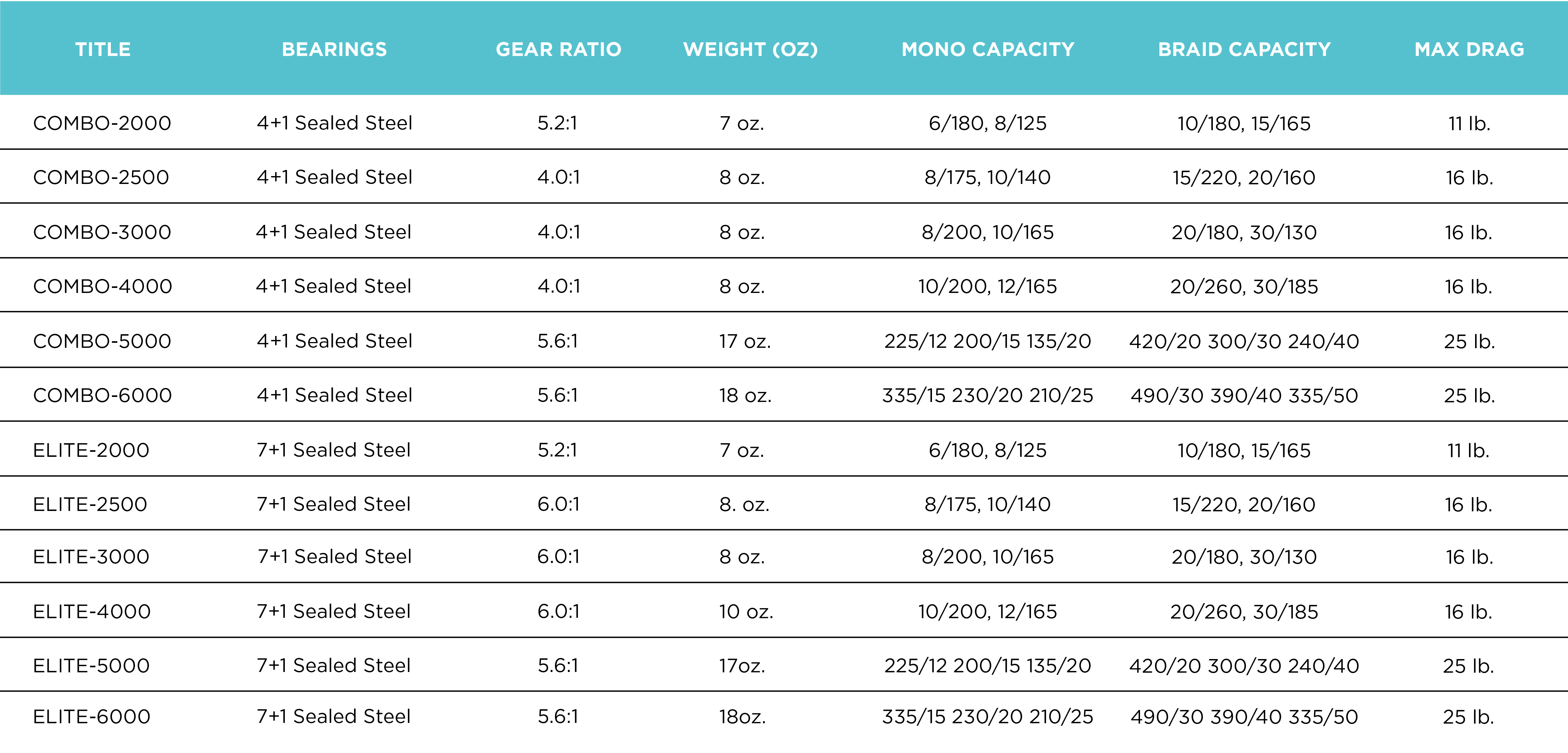 COMBO SPINNING REELS SPECS