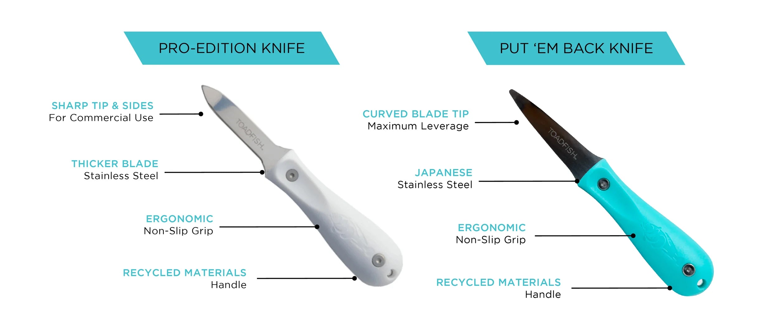 - Professional Edition Oyster Knife - Designed for opening thicker-shelled oysters and use in commercial-volume kitchens for experienced shuckers, the Toadfish professional edition oyster knife is for serious oystermen. This commercial oyster knife features a thicker blade design than the signature Put Em’ Back™ Oyster Knife with less flex, more shucking power, and increased leverage.