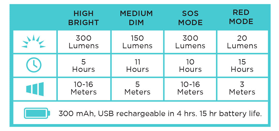 - Bright, Dim, SOS, Red, & Green Light Mode